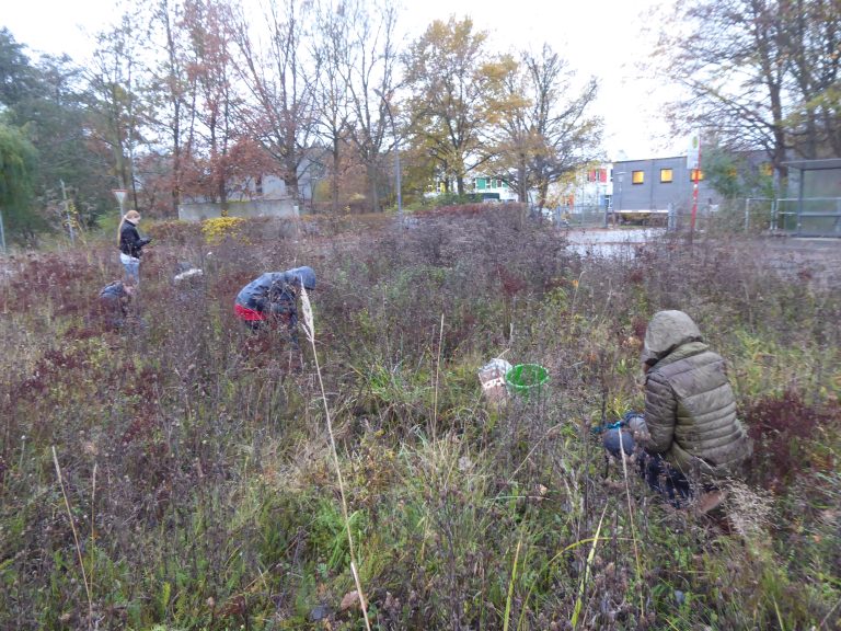 Die 2022 geschaffene Blühfläche auf der Verkehrsinsel bei der Bushaltestelle der Schule am Mittleren Landweg hat sich gut entwickelt, aber es fehlten noch Frühblüher. 550 Zwiebeln haben wir gekauft und die wurden dann wieder von der Jugendgruppe der Loki-Schmidt-Stiftung an einem sehr nassen und kalten Tag Ende November gepflanzt.